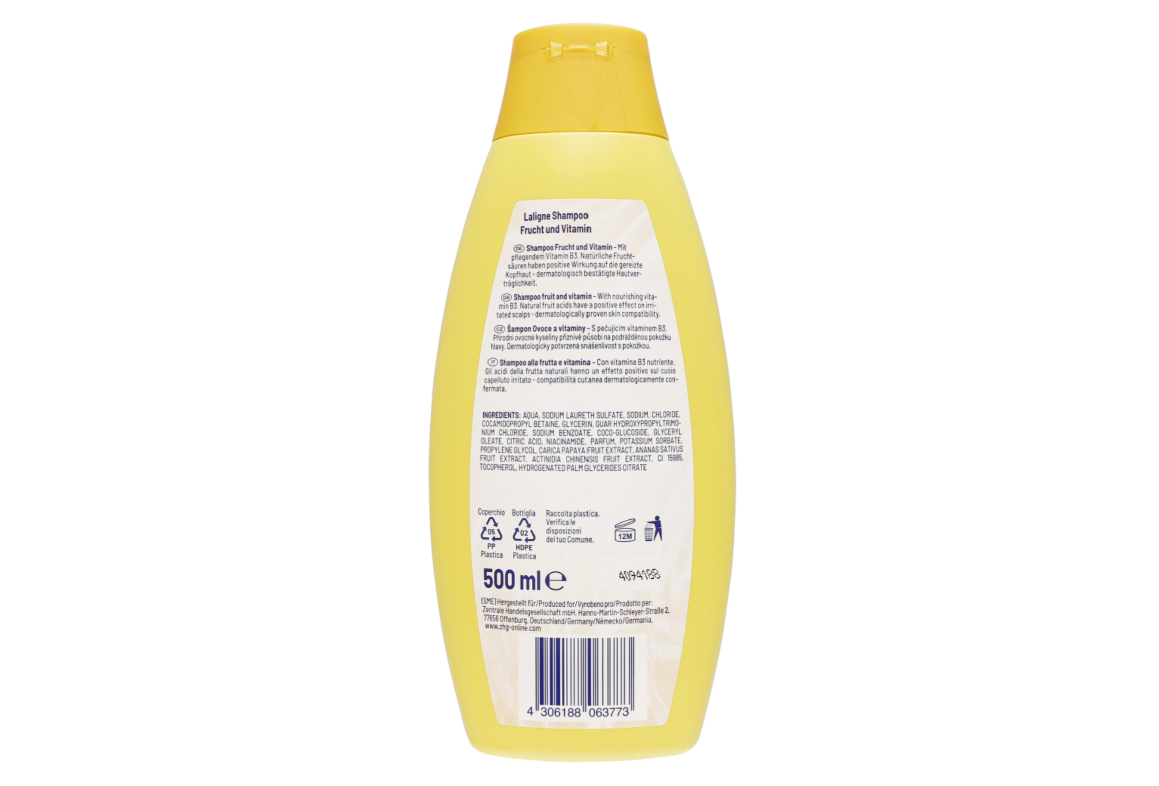 Shampoing aux fruits et vitamines enrichi en vitamine B3 nourrissante. Les acides de fruits naturels ont un effet positif sur les cuirs chevelus irrités.