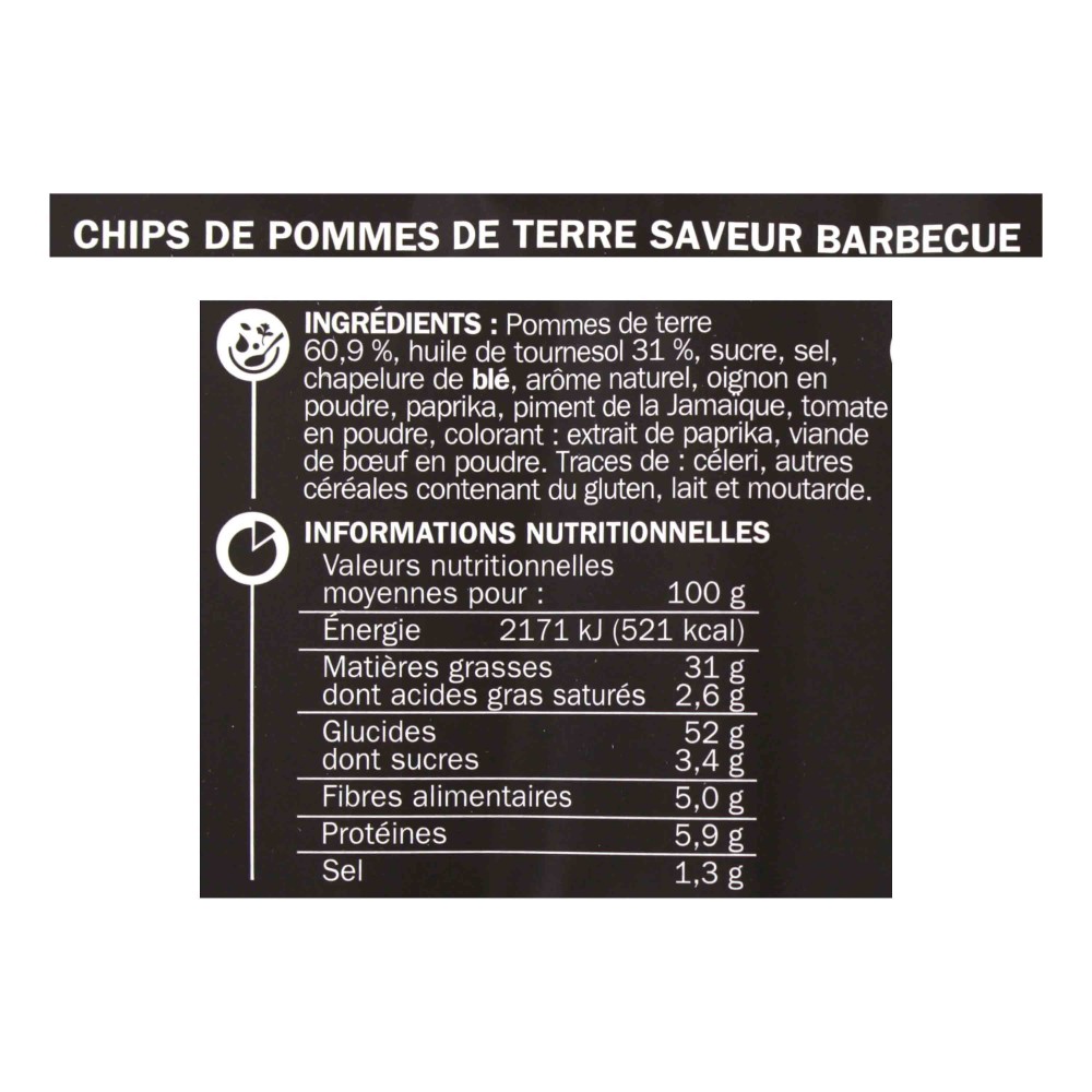 pommes de terre, huile de tournesol, arômes naturels barbecue, sel, sucre, paprika en poudre, arôme fumé, exhausteur de goût (glutamate monosodique), épices.