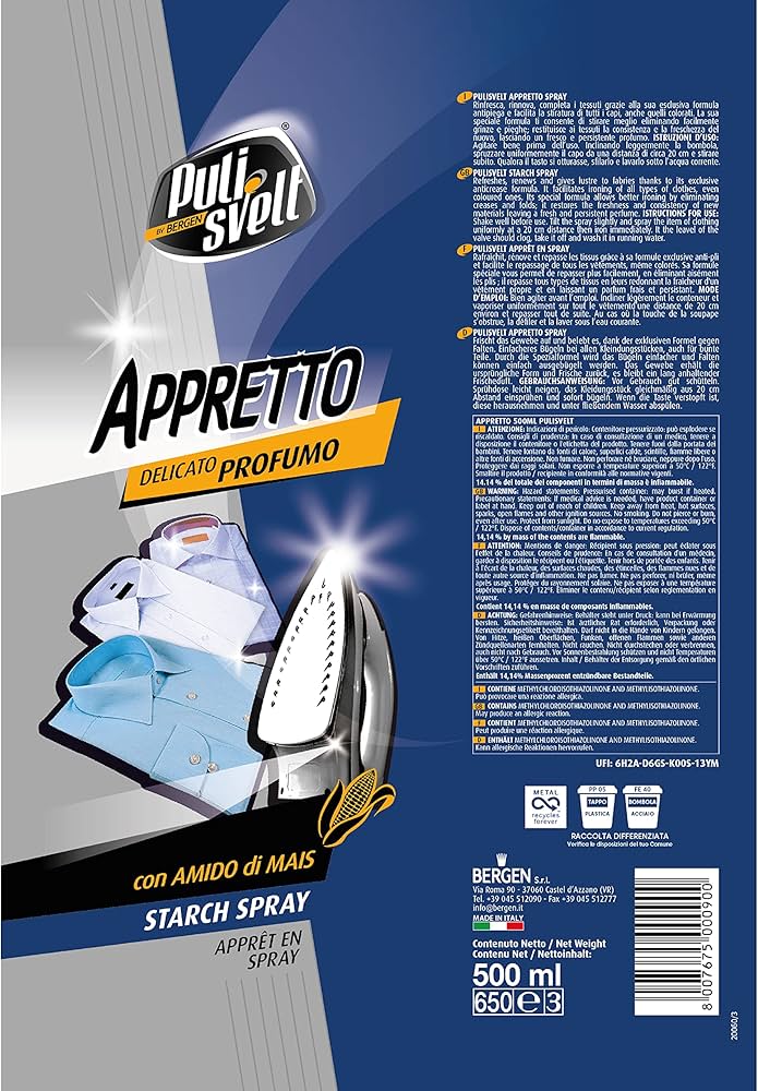 PULISVELT rafraîchit, ravive et sublime les textiles grâce à sa formule anti-froissage exclusive, facilitant le repassage de tous les vêtements, même colorés. Sa formule spéciale permet un repassage optimal en éliminant facilement les plis et les froissements, en redonnant aux tissus leur texture et leur fraîcheur d'origine, et en laissant un parfum frais et durable. Formule naturelle à l'amidon de maïs.