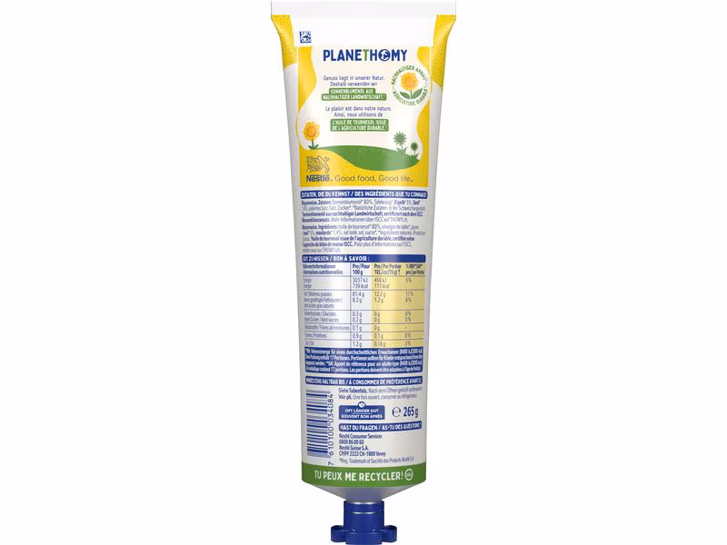 La mayonnaise à la française de Thomy est la cerise (sur le gâteau) sur tout, et ce depuis l'enfance! Le goût crémeux et incomparable de la mayonnaise typique de Thomy transforme une simple tranche de pain ou un œuf dur en un délice absolu. La mayonnaise à la Française est fabriquée à Bâle avec seulement six ingrédients et les œufs proviennent d'élevages en plein air contrôlés. La mayonnaise à la Française de Thomy est la cerise sur le gâteau: avec des œufs, une salade de pommes de terre, des burgers, des frites, un steak ou un poisson grillé, une salade ou des légumes croquants.
